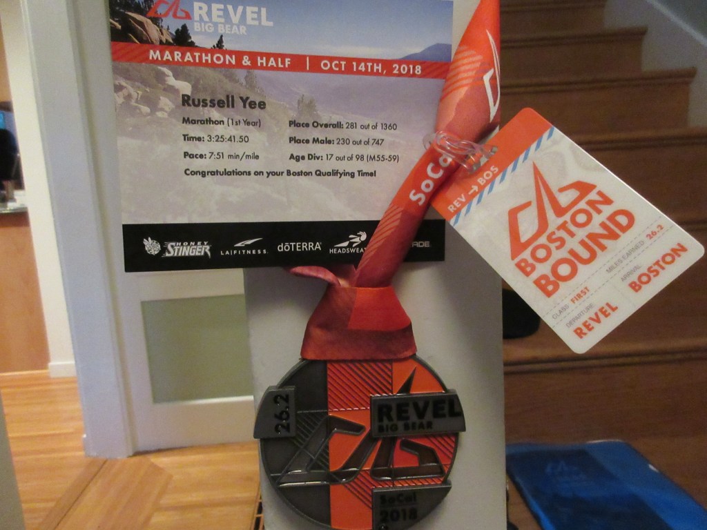 - Oct. 14, 2018 (age 57, Boston Qualifying = 3:35; cutoff = 1:39, so 3:33:21)