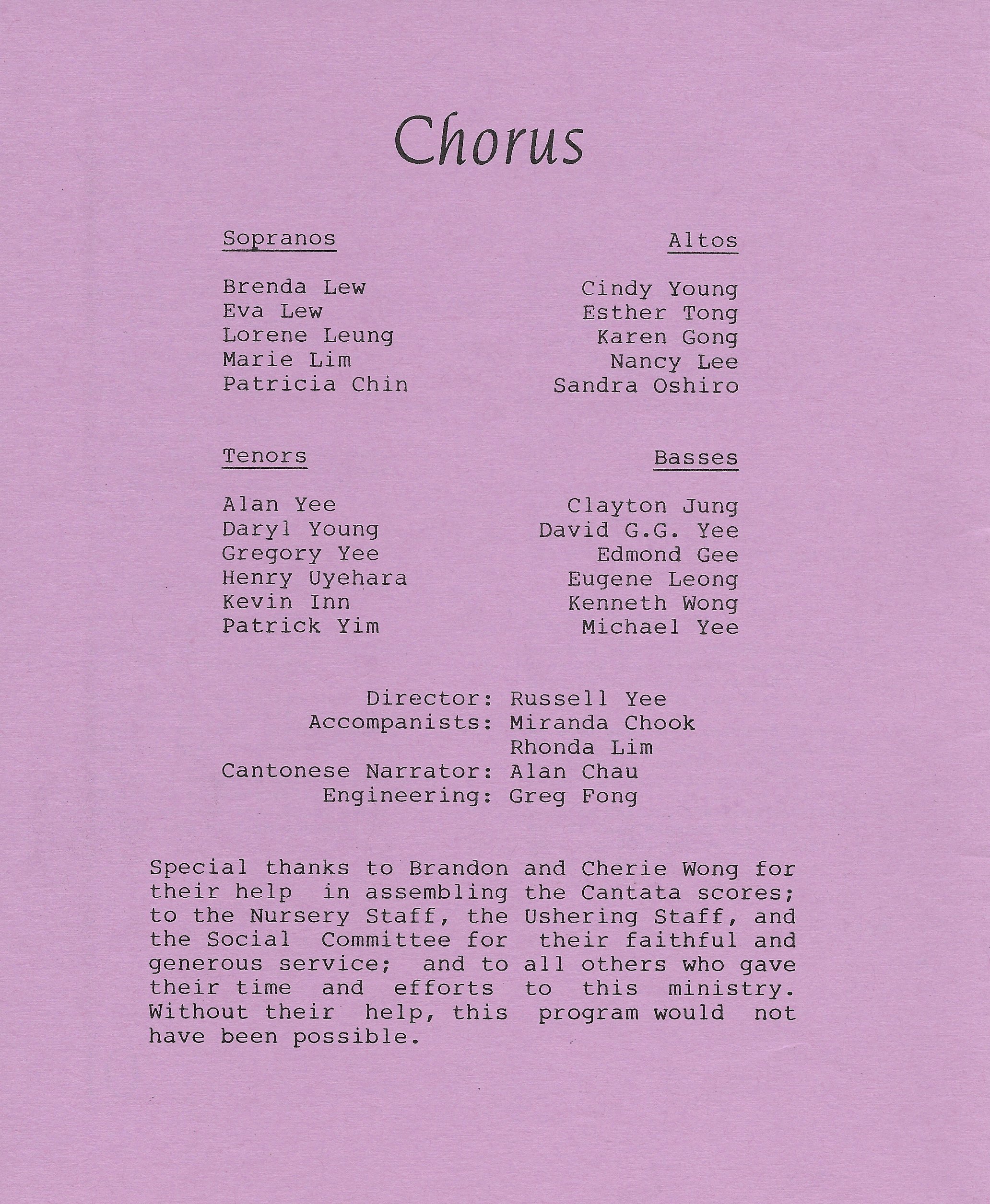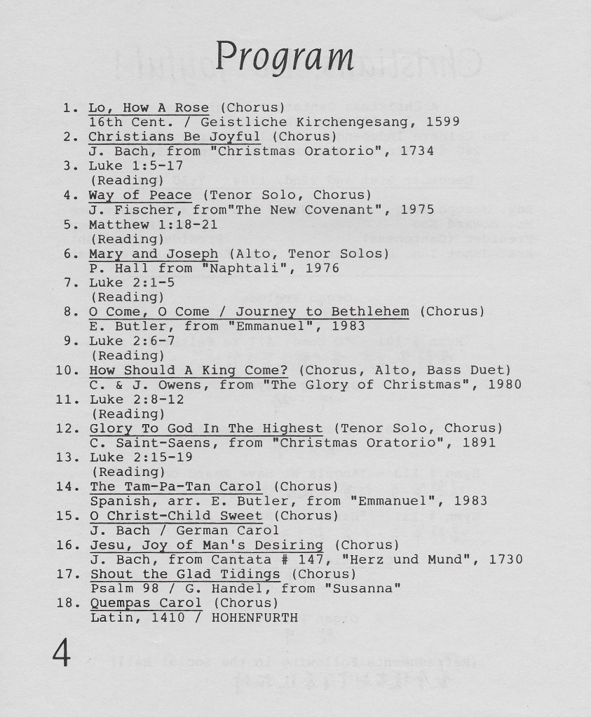 This was the 1984 Christmas Cantata for the Chinese Independent Baptist Church, Oakland. I chose and assembled the pieces (from both classical and contemporary genres), designed and produced the program, and directed the choir. I have a cassette tape recording somewhere I’ll have the digitize someday. Looking back I can’t believe how ambitious we were–eighteen separate pieces! But somehow I didn’t include one of my all-time favorite pieces, John Fischer’s 1974 setting of Reginald Hebert’s “Brightest and Best.”