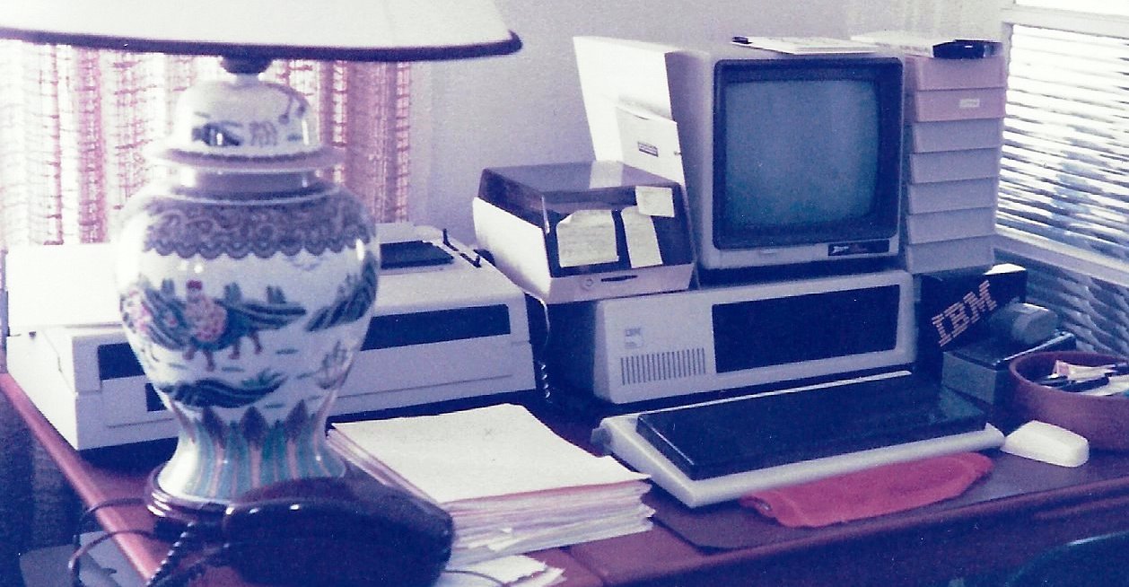 Intel 8088, 4.77 KHz. Hardcard 10mb internal hard disk. Silver Reed daisy wheel printer, then Toshiba dot matrix. I fondly remember installing individual memory chips by hand. Those were the 5.25″ floppy disk days. I ran Microsoft Word 1.0 and this was back when Word came packaged with a mouse (seen here in the bottom right, it was mechanical with a steel ball) because few PC users had mice then (it plugged into an expansion board that plugged into the motherboard). Got a programming job writing database applications on dBASE II/III back when personal computers were just barely starting to show up in corporate offices. Later it served for many years as a nostalgic printer stand. I still have it and fire it up once in a long while for old time’s sake.