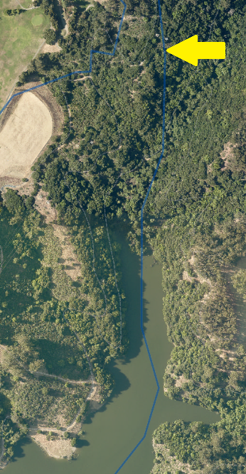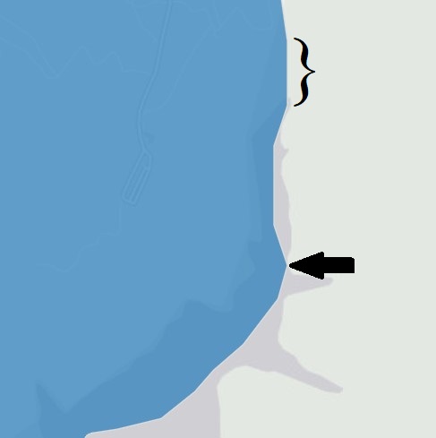 The point is at the top of a short, nearly vertical boundary segment (bracketed above), but the bottom of that segment is about 12 feet more westerly. Below it is a point in the lake (arrow above) that is about 34 feet more westerly, though above they nearly look aligned.