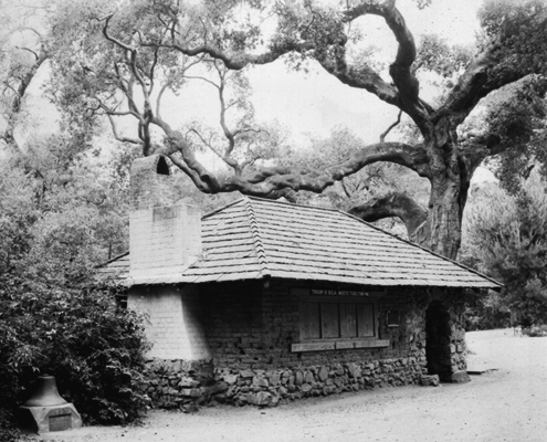 Scout Hut, c. 1920s/30s, Peralta Adobe bricks visible between foundation and roof; at some point the hut was rebuilt, leaving only one partial wall of adobe bricks (here, in the far wall, out of view, adjacent to the Dimond Oak); some of the bricks were incorporated into a low sitting wall around the Dimond Oak