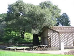 Dimond Oak c. 1995, before becoming distressed and being cut; partial wall of remaining Peralta Adobe bricks visible adjacent; on the bottom left is the low bench/wall (now removed) that formerly had underneath other surviving bricks reused from the hut rebuilding