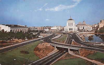 Surely the least-missed landmark is this 12-lane interchange with over- and under-crossings connecting both E. 14th and E. 12th with 12th Ave. and 14th Ave. It was sometimes derided as “the world’s shortest freeway.” To build it, the large gardens in front of the Auditorium were removed and a parking lot installed over the remaining land. The only pedestrian crossings were via foreboding underground passageways. Fittingly, the Viaduct’s first ancestor was a much-resented 1853 toll bridge along 12th St., built by Horace P. Carpentier, Oakland’s first mayor.