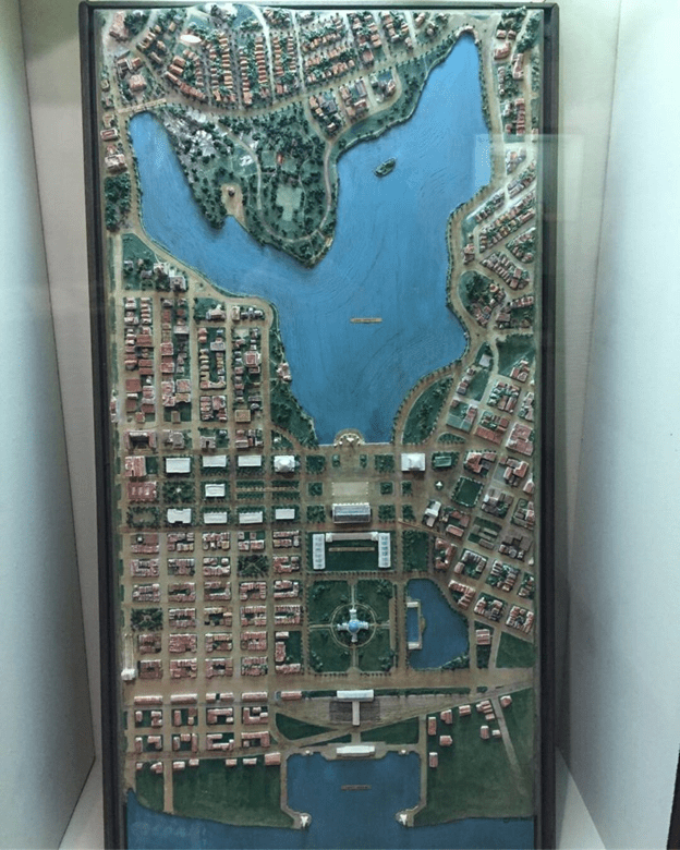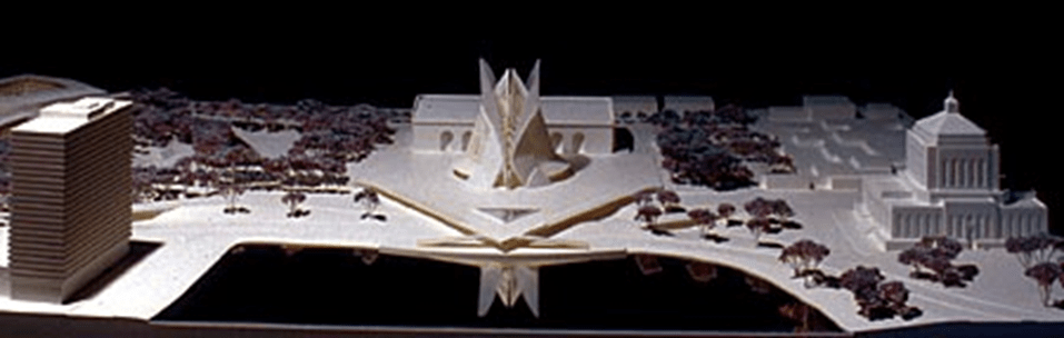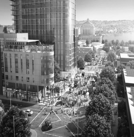 A 1947 Civic Center plan imagined a complex of government buildings, an opera house and symphony hall, a sports arena, and a large civic plaza in the Museum neighborhood. While Alameda County offices and the Museum itself came to fruition, City, State, and Federal buildings eventually clustered downtown around City Hall.