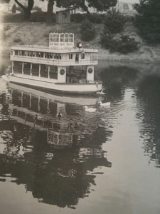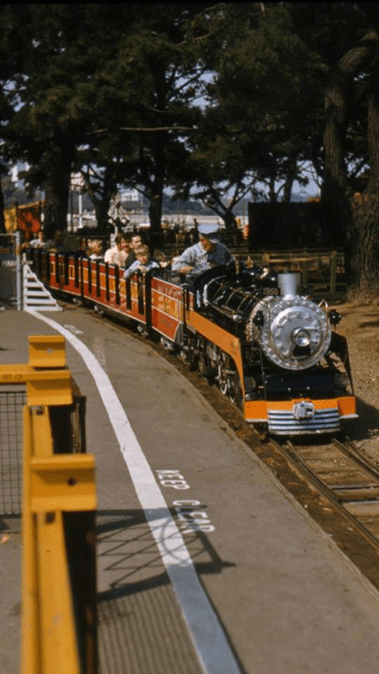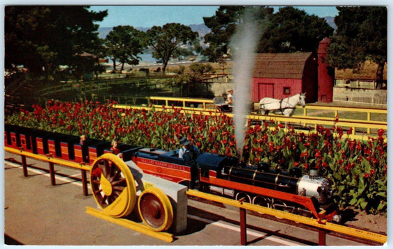 Spanning Lake Merritt Channel to the southeast of the Auditorium was a small amusement park. At various times it featured: the Oakland Acorn narrow-gauge steam railway, the Lil’ Belle paddlewheel boat, a stagecoach, the Star Flyer (an early virtual reality spaceship attraction), and farm animals. The area continues as Peralta Park, with much of the land restored to wetlands and the former fill and culvert over 10th St. daylighted.