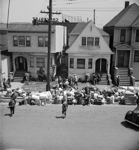 Oakland’s prewar Japanese community of some 1,800 residents and several hundred professional offices, storefronts, restaurants, churches, schools, temples, associations, and businesses was notably spread throughout many neighborhoods. However there was a substantial presence intermingled with Chinatown, especially in the Madison Square neighborhood, adjacent to the Museum. At the time of the infamous Executive Order 9066, Oakland’s Japanese residents reported to the Civil Control Station at 1117 Oak St., now the Alameda County Law Library, across Oak St. from the Museum. Among Dorothea Lange’s internment images is this May 1942 picture of families preparing to be removed. These three houses were on Oak St. where the Museum parking entrance is today. (Note the “CHEVROLET” billboard above the former R.A. Doty dealership).