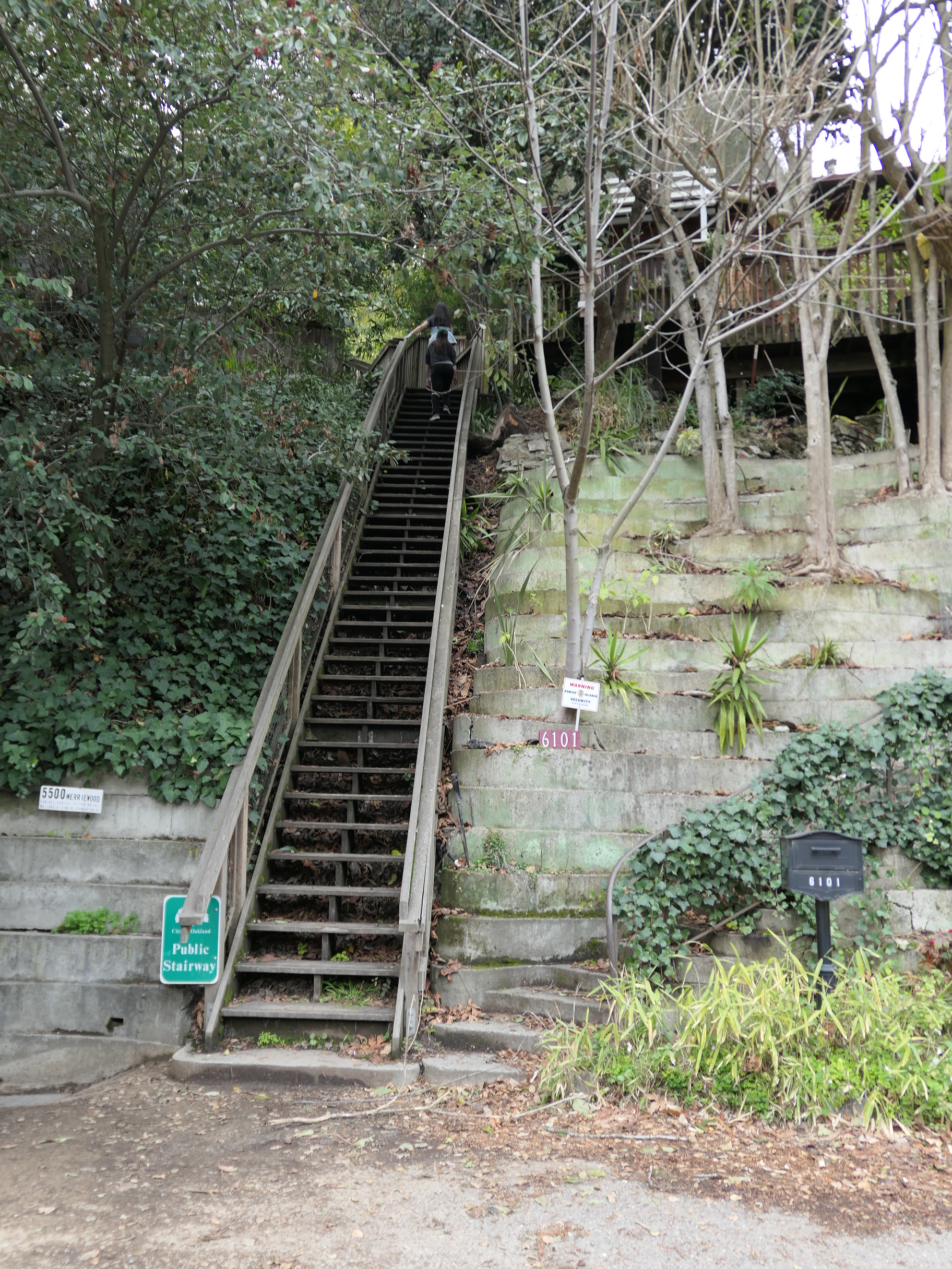 Longest set of public staircases: Lower & Upper Merriewood Steps, off Thornhill Drive (opposite Thornhill Ct., just beyond Thornhill Elementary School) in three flights, 99 + 168 + 123 = 390 steps: