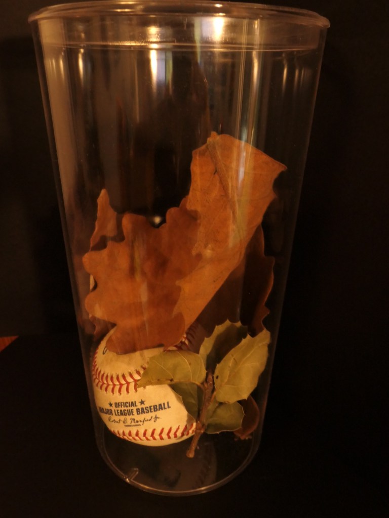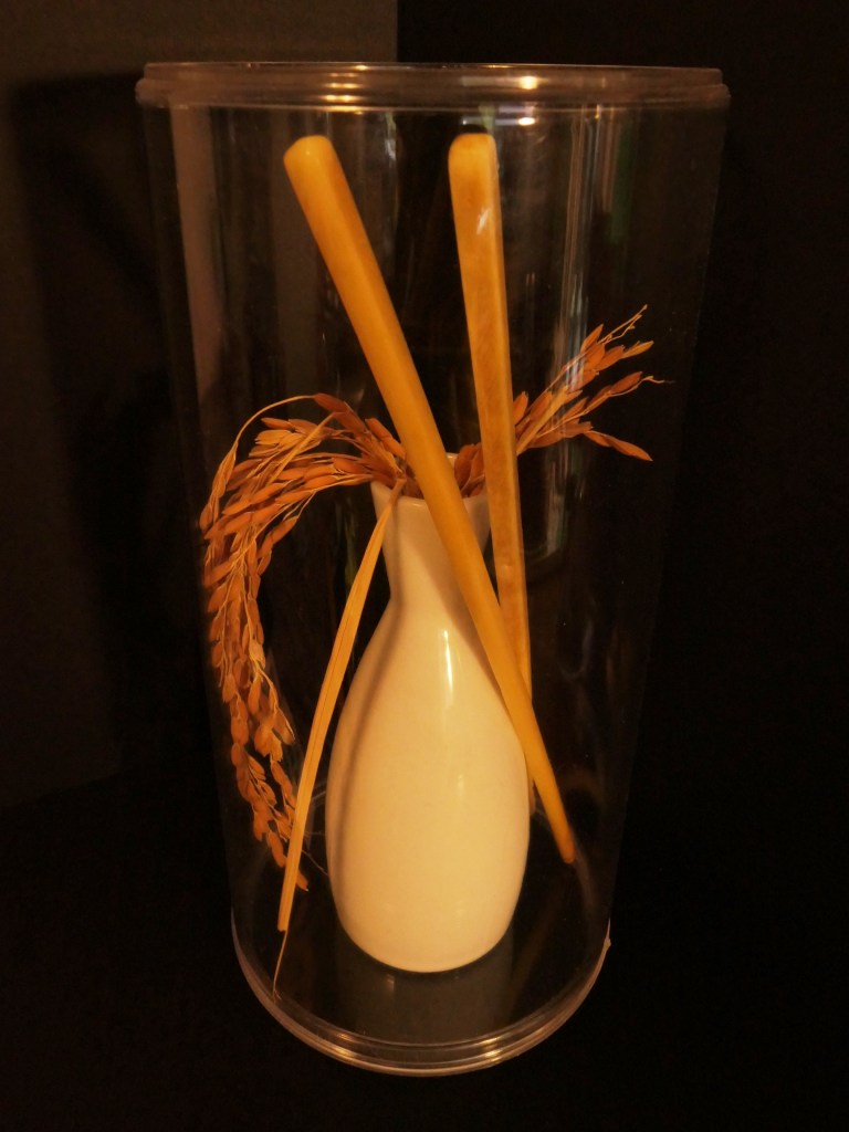Rice panicles from Toi San County, Guangdong Provice, China–the grain that fed my ancestors for countless generations; Lisa’s childhood ivory chopsticksFrom our wedding: Communion cup, toasting glass, lacquer chopstick favor, and bridal bouquet petalsA’s game foul ball, leaves from the Jack London Oak, leaf from the Daimyo “Burlingame” Bonsai Tree, leaf from a 9/11 Memorial NYC swamp white oak