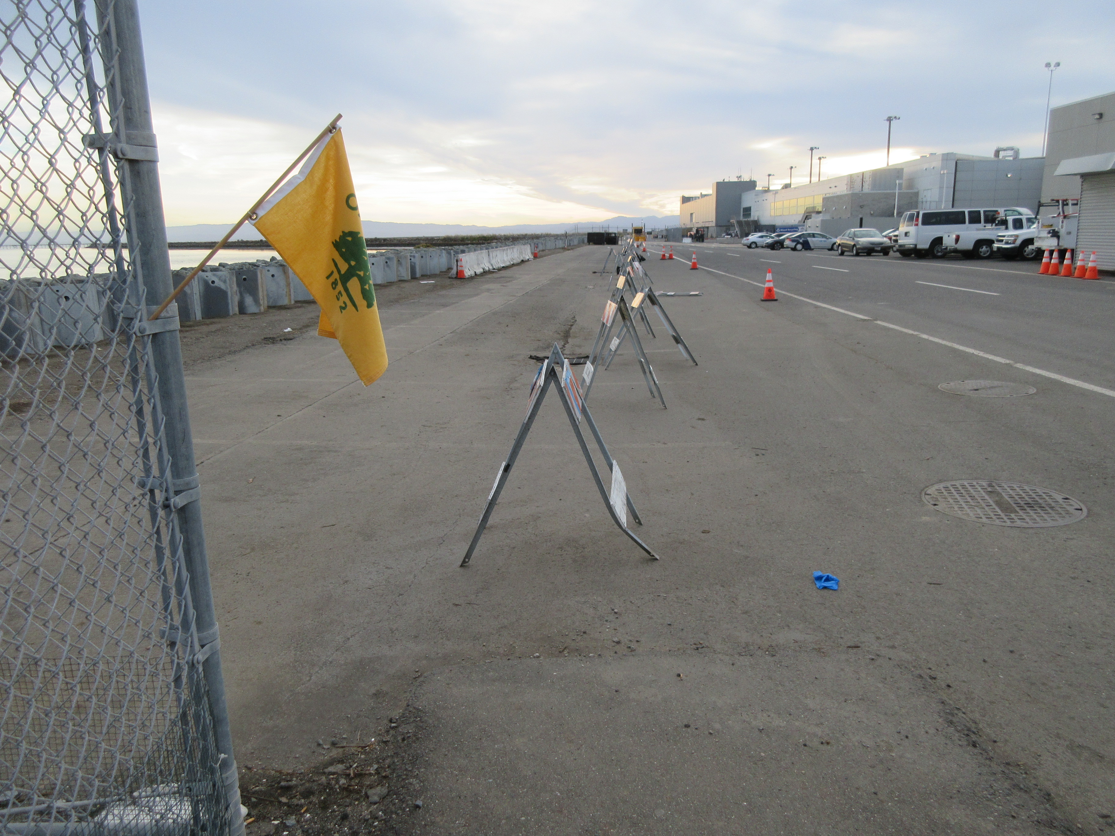 There are no signs and nothing to prevent you from going southward beyond the staff parking and dumpsters to the actual staffed security gate but, the guard that day told me I was only allowed as far as an earlier, disused guard kiosk (visible above); putting me at 37.71119143768023, -122.21011890805227.