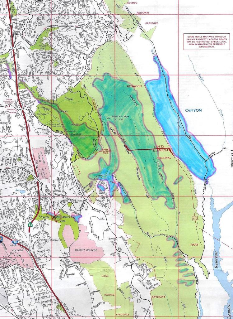 But in the end the very species that first brought depredations to these redwoods and imported menacing flora will, it would seem, ensure that the forest will not disappear. In 1928, the Save-the-Redwoods League intervened to preserve the “Hights” around Joaquin Miller’s estate. The City of Oakland eventually acquired it to help assemble today’s 425-acre Joaquin Miller Park. That park, upper Dimond Park, and Leona Heights Park include most of the former San Antonio stand. In 1939 the 1,494 acres that would become the bulk of Redwood Regional Park were acquired from the East Bay Municipal Water District by the still-new (and still breathtakingly foresightful) East Bay Regional Park District, for $246,277. That preserved the former middle stand. (In 1997, Oakland purchased an adjacent 21 acres from a developer for $3.75-million in order to protect a sensitive part of the Redwood Creek watershed.) The former Moraga stand is now mostly EBMUD watershed lands extending south and west from the the town of Canyon, between Pinehurst Road and Redwood Regional Park. Thus, the former Palos Colorados in substantially all its original range is free to continue regenerating a forgiveness forest. Somehow, we found it in ourselves to not turn it into housing, highways, farms, or even rangeland.