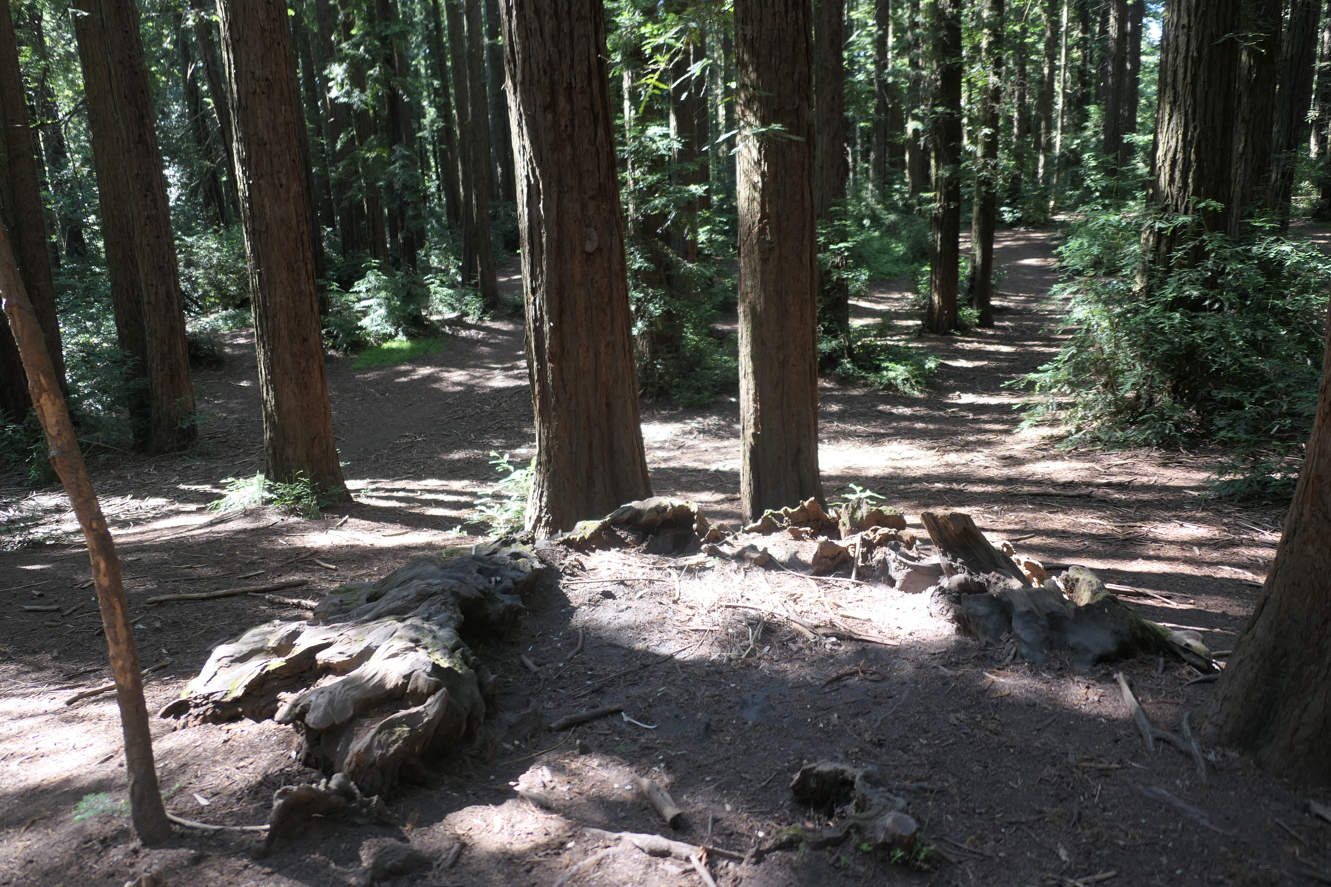 If the great stumps remained in the hills, at least they would still bear witness to what was lost. Alas, very few stumps remain. Dr. Gibbons reported that even the stumps were ravaged, broken up for firewood, much of it, it’s thought, by Chinese immigrants. He reported that one grubber bragged of taking fully seven cords of four-foot wood from a single stump. That would make a woodpile eight feet tall and twenty-eight feet long. (As a not-very-dense softwood, redwood burns fast and not very hot, making it a second- to third-rate firewood.) Again, my mind reels at the effort it must have taken, chopping out the wood, hauling it out, haggling over its price. Undoubtedly some of this wood fed the boilers of the steam mills, like boiling a kid in its mother’s milk. The remains of one large stump are across from the entrance of the Archery Range. In 1971, Oakland Park ranger Louis O’Dell reported finding the remains of another stump, also near the Archery Range, with progeny from sprouts almost 33 apart–perhaps Dr. Gibbon’s mighty stump.