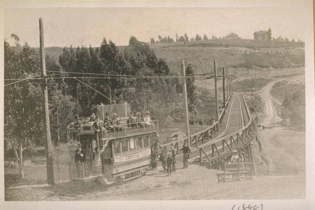 The nearby Trestle Glen neighborhood is named after a large rail trolley trestle that stood there approx. 1893 – 1906. It was somewhere in the vicinity of the present Grosvenor Ave. but the exact alignment has curiously eluded local history buffs, this despite several surviving photographs and some period maps. You can catch up with the debate here. Where was the actual alignment?