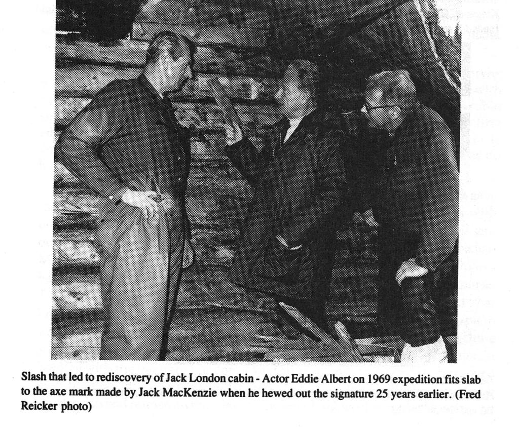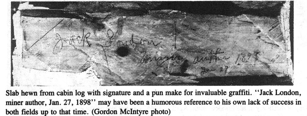 The 1969 rediscovery and verification of Jack London’s Yukon gold rush cabin hinged on Jack’s autograph on a log in the back wall of the cabin. The autograph slab had been cut out by a local woodsman in the 1940s, but was located and matched to the log on site in 1969. But what happened to the autograph slab after that? It’s not in the relocated cabin(s), though the cut log is (circled below). Was it ever reattached? Has anyone seen it anywhere?