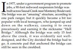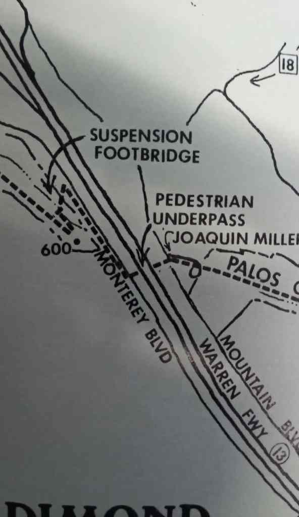 As reported in this 1998 guide to the Sausal Creek watershed, in 1977, a substantial pedestrian suspension bridge was built across Sausal Creek, just below Monterey Blvd, in the lovely grove of redwoods there. It didn’t last long and today only the concrete and steel suspension cable anchors remain. There must be pictures of the suspension bridge somewhere but I have been unable to find one.