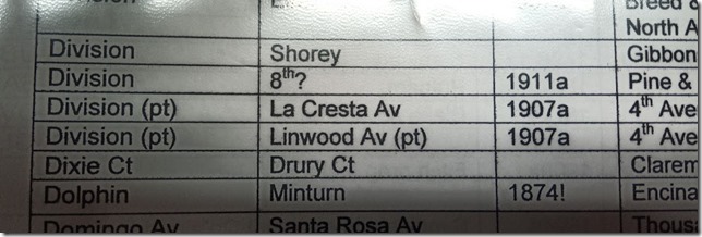 The Oakland History Room has a binder of street name changes. It lists the change of Division to La Cresta as happening in 1907. Since homes here were not built until the 1920s, it looks like the name change happened before anyone actually lived here in the present houses. But the exact timing and reasoning remain to be elucidated, especially since there is no notable topological “crest” along La Cresta (though there is one on the far side of the adjacent Everett Ave.).