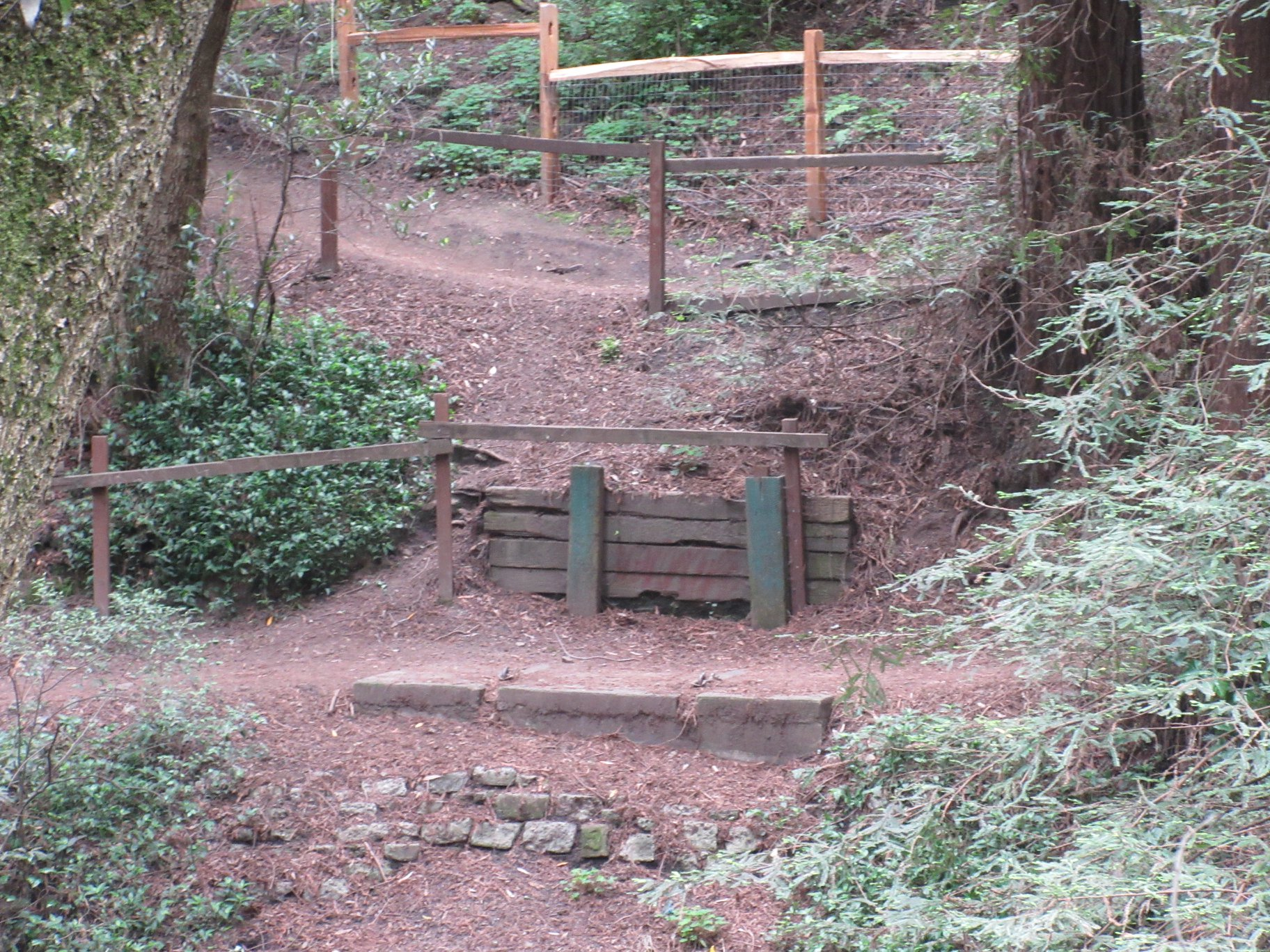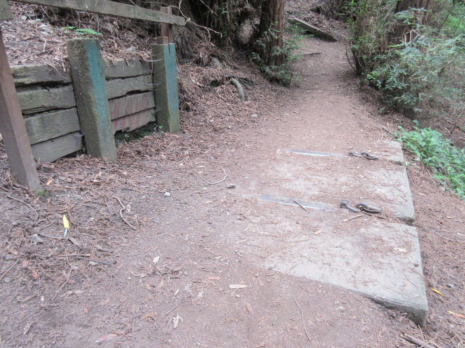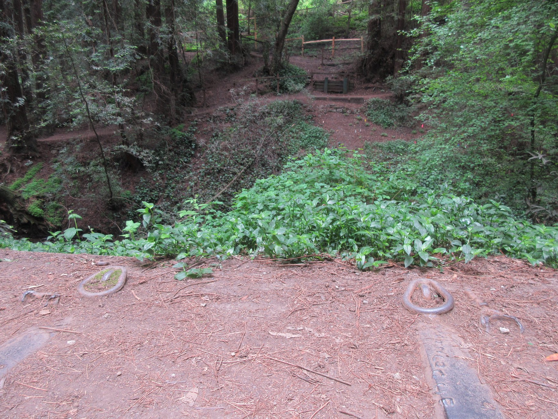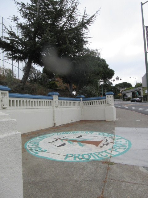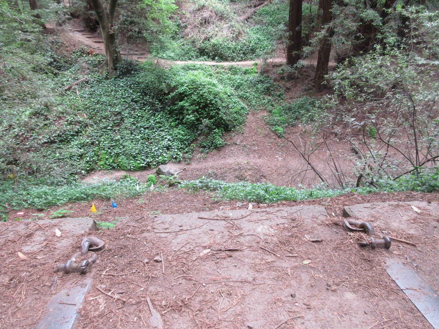 As reported in this 1998 guide to the Sausal Creek watershed, in 1977, a substantial pedestrian suspension bridge was built across Sausal Creek, just below Monterey Blvd, in the lovely grove of redwoods there. It didn’t last long and today only the concrete and steel suspension cable anchors remain. There must be pictures of the suspension bridge somewhere but I have been unable to find one.