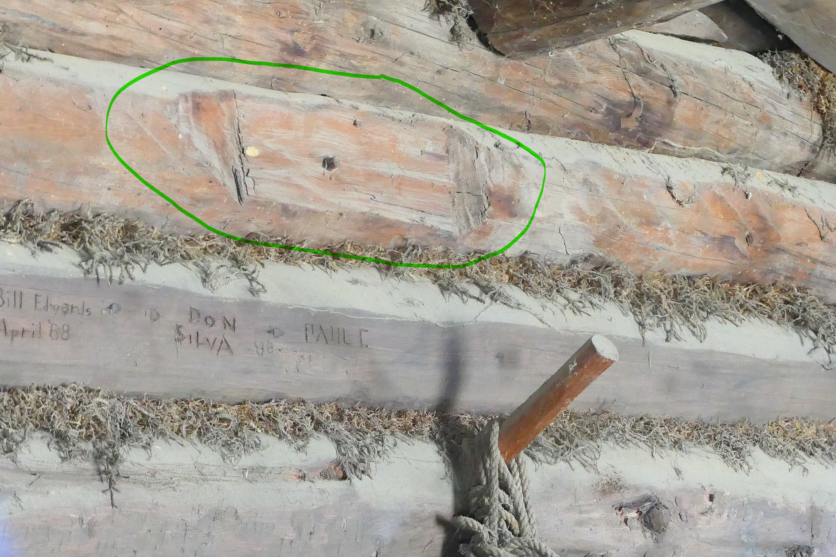 The 1969 rediscovery and verification of Jack London’s Yukon gold rush cabin hinged on Jack’s autograph on a log in the back wall of the cabin. The autograph slab had been cut out by a local woodsman in the 1940s, but was located and matched to the log on site in 1969. But what happened to the autograph slab after that? It’s not in the relocated cabin(s), though the cut log is (circled below). Was it ever reattached? Has anyone seen it anywhere?