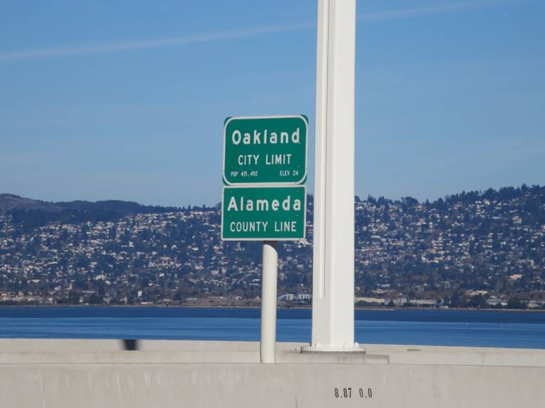 Accessible on roadway over water (W2): A point on the Skyway portion of the Eastern Span of the San Francisco-Oakland Bay Bridge, just about exactly 2 miles westbound from the Toll Plaza, or just a hair over 1 mile eastbound from the exit of the Yerba Buena Tunnel (there are easy-to-miss county border signs alongside); the border point on westbound Lane 5 (slow lane/breakdown lane) is the westernmost, 37.819259, -122.3498551; 37.81742269, -122.34913838; on the other side of the bridge, the border crosses the pedestrian/bike path there at 37.818674, -122.349643