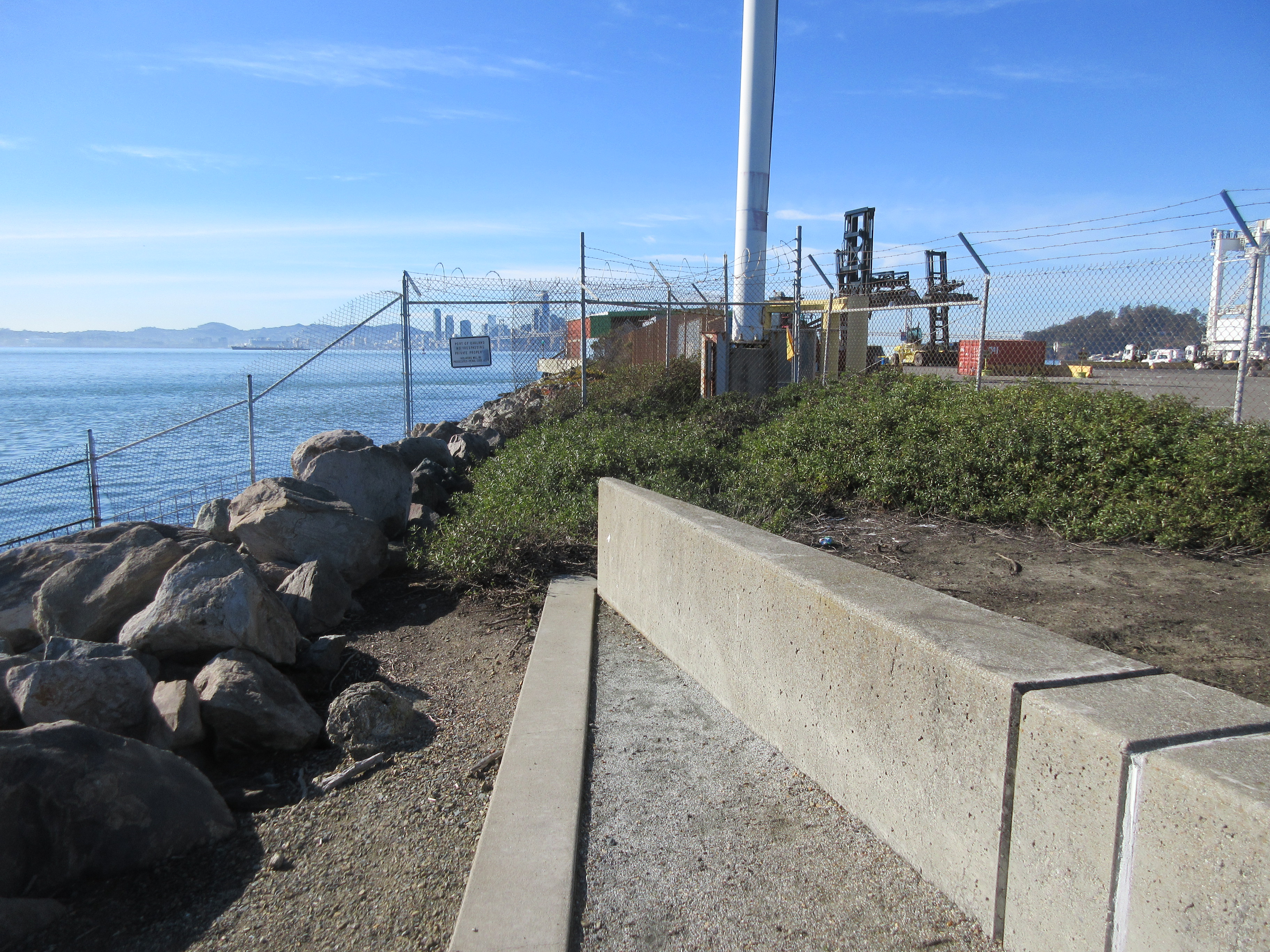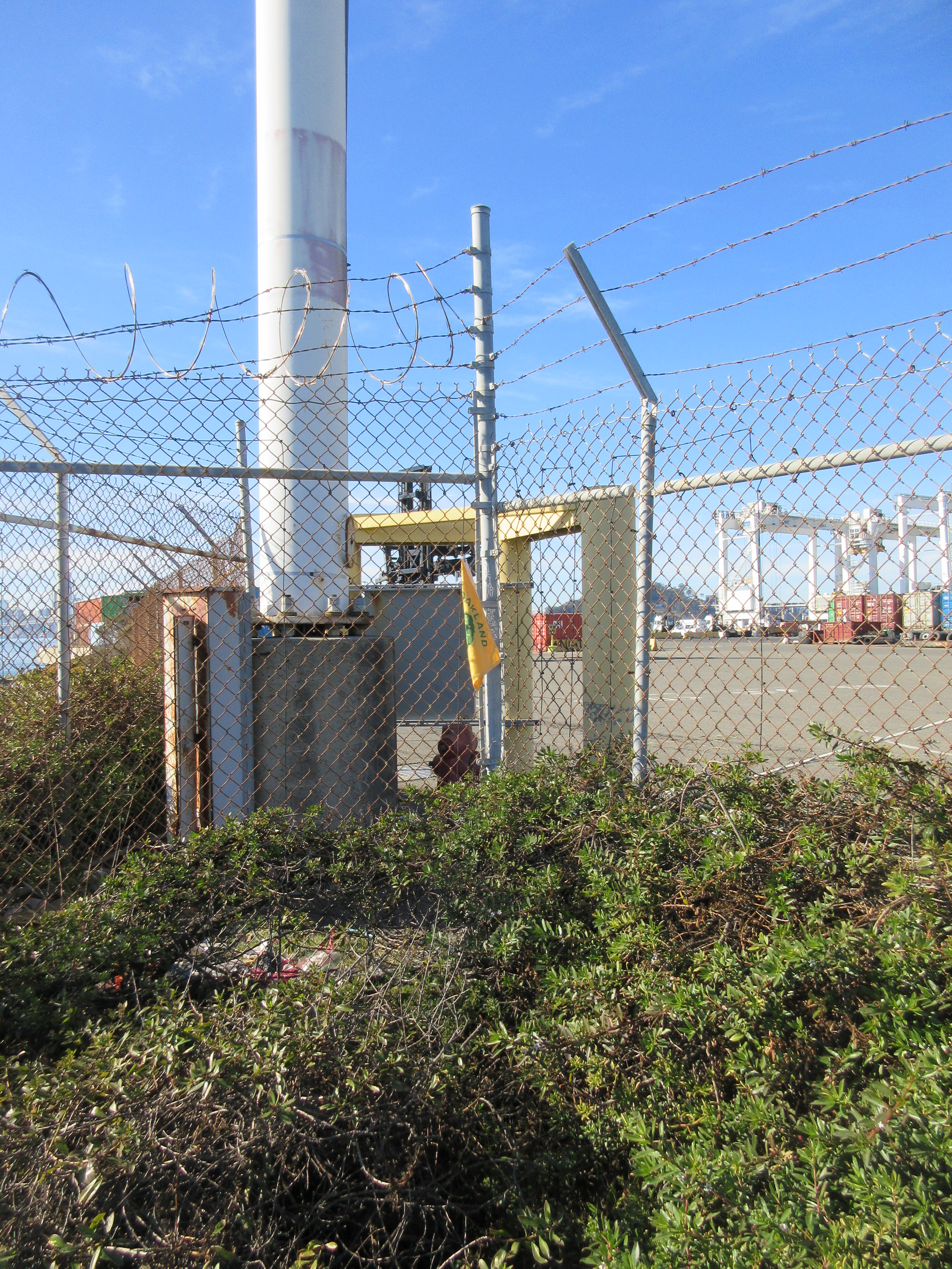 On land, publicly accessible (W3b): At the end of Port View Park, at the far right fence line, behind the bushes, 37°48’14.43″N 122°20’24.51″W (37.804016, -122.340127)